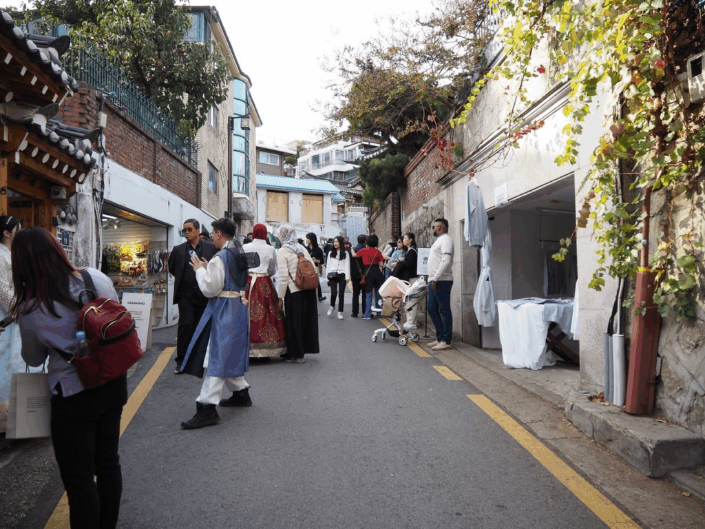 特に石畳の北村韓屋村や人が多い広蔵市場などでは、タイトスカートよりもゆったりしたワイドパンツやワンピースがおすすめです。